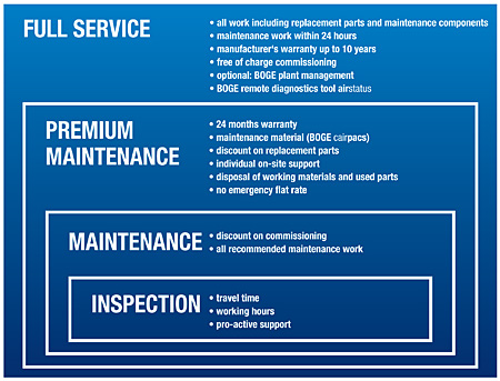 Service that lives up to its name: BOGE service allows you to concentrate one hundred percent on your work. There's no need to keep an eye on when the next inspection for your compressed air station is due. No need either to ensure that regular maintenance is carried out and documented. You can rest assured that there'll be no unexpected costs. All you need to do in fact is: speak to us about your requirements and we will generate a service package to suit your needs.The Principle Behind Our Service: Tailor-made to meet individual requirements. The various service packages largely build on each other. Nearly all features contained in the inspection package are included in the maintenance package. The premium maintenance package, in turn, includes the features of the maintenance package. And finally, the full service package provides the widest range of features. In this way, it is easy for you to achieve the ideal package in every respect. As a rule of thumb: the more comprehensive the service agreement, the more that you, as the compressed air station operator, can rest assured that the safety and functionability of your system is being taken care of for you.